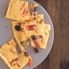Remove the pan from the oven and carefully grease with olive oil. Working quickly, pour the batter into the pan, tilting the pan if necessary to evenly cover it with batter. Arrange the olives, bell pepper strips and anchovy fillets evenly over the surface of the batter.