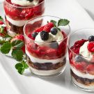 This dessert features all the “good stuff” of cheesecake—rich cream cheese, sweet graham crackers and fresh berries—in an easy-to-make form. And best of all, you don’t have to turn on your oven in the heat of summer. To create these beautiful trifles, a simple cheesecake cream, two kinds of berry compotes and crushed graham crackers are layered in clear glasses. They can be assembled a few hours in advance and refrigerated, so they’re ideal for summer entertaining.