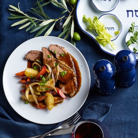Thinly slice the brisket against the grain and transfer to the platter with the vegetables. Spoon a little of the warm pan juices over the brisket and pass the remaining juices at the table. Serves 8.