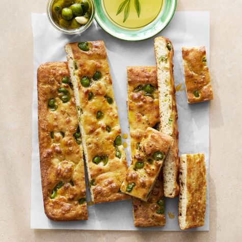 A type of Italian flatbread, focaccia can be topped with an endless array of ingredients. Here we keep it simple and call for Castelvetrano olives, a mild-tasting green variety with a buttery, meaty texture. Cut the savory bread into slices and serve with your best extra-virgin olive oil for dipping. This makes a great appetizer for summer gatherings or anytime of year. Enjoy the focaccia warm from the oven or at room temperature—it’s delicious either way.