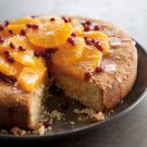 Just before serving, top the cake with the orange slices and pomegranate seeds and drizzle with the honey. Cut into wedges and serve. Serves 12.