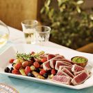 Cut the tuna into slices 1/2 inch thick. Serve at room temperature with salsa verde and grilled potatoes with tomatoes and olives. If not serving the tuna immediately, cover the cooked tuna with plastic wrap and refrigerate up to overnight. Remove it from the refrigerator 30 minutes before serving. Serves 6.