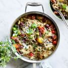 Although the Italian classic pasta puttanesca traditionally includes anchovies along with the capers, olives and tomatoes, we omit them in this easy one-pot version for a vegetarian weeknight meal. If you prefer even more bright, briny flavor, you can increase the quantity of capers to 1/2 cup (3 oz./90 g).