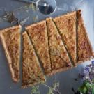Unlike a quiche, this savory tart from Joshua McFadden’s Six Seasons: A New Way with Vegetables, is filled with very little custard in order to let the sweet onions dominate. This is delicious reheated the next day, so it's a good make-ahead dish for entertaining. Chef McFadden calls for a 10-inch (25-cm) round tart pan, but if you’d prefer to make it an 8-by-11-inch (20-by-28-cm) rectangle, as we’ve shown here, simply use all of the dough (instead of only two-thirds) and multiply the quantities for the filling by 1.5. The walnut dough for the crust is a rich dough, meaning it has a high butter-to-flour ratio. That makes it a touch tricky to roll, as do the nuts, but the final crust is so delicious that it's worth the tiny bit of fuss. The dough freezes well, too, so make a double batch and keep one in the freezer; it will stay perfect for 3 months or longer. Let frozen dough thaw overnight in the fridge.