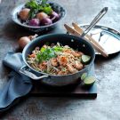 Although pad Thai—perhaps the most iconic Thai dish of all—is traditionally made with rice noodles, in this inventive version it is made with fresh homemade pasta, which can easily be prepared at home using a Philips pasta maker. Using our tamarind- and lime-infused prepared pad Thai sauce also helps you get dinner on the table in less time that it would take to have Thai food delivered. If you prefer, substitute wide rice noodles that have been soaked in water until they are pliable for the egg noodles.