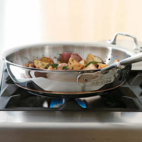 These fried potatoes get a flavor boost from smoky bacon, garlic and fresh herbs. Be sure to dry the potatoes well before frying to help prevent spattering.