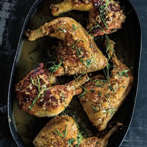 Starting a dish on the stove top and then finishing in the oven is ideal for the dark meat of chicken legs. Parsley, tarragon, shallot and white wine combine to create this bright-tasting pan sauce.