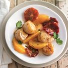 This colorful winter dish showcases two types of oranges: the standard navel orange and the crimson blood orange, which make a refreshing counterpoint to seared sea scallops. Originally from Sicily, blood oranges have a distinctive red flesh and juice and a flavor reminiscent of berries.