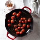 When you can find cherry tomatoes on the vine at the farmers’ market, show off their pretty color and fresh summer flavor by preparing them simply, tossing them with olive oil and cooking them briefly over high heat to bring out their sweet flavor. Serve alongside your favorite grilled steak for an easy summer treat.