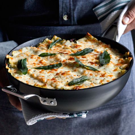 Using no-cook lasagna noodles streamlines the process of putting together this gorgeous skillet lasagna; soaking them in hot water for 10 minutes will ensure that they turn out tender rather than chewy. If you prefer, you can garnish the finished dish with chopped fresh sage instead of fried sage leaves.