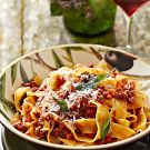 Pappardelle bolognese is a hearty pasta dish that combines ground pork, ground beef and pancetta to add great flavor to this classic Italian sauce, which is tossed with wide pasta noodles known as pappardelle. This pappardelle bolognese recipe can also be made with ricotta for anyone who loves cheese. Be sure to cook the pasta until it’s just al dente—tender but still a bit chewy. You won’t need all of the sauce for this dish; you can store leftover bolognese sauce by freezing the rest to serve again with pasta or to use in lasagna.