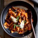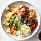 In this recipe, a sauce made from slow-cooked pork is topped with burrata, a ball of fresh mozzarella with a creamy center, for an especially impressive pasta dinner. Fresh pappardelle can be found at many grocery stores and Italian delis, or you can make your own.