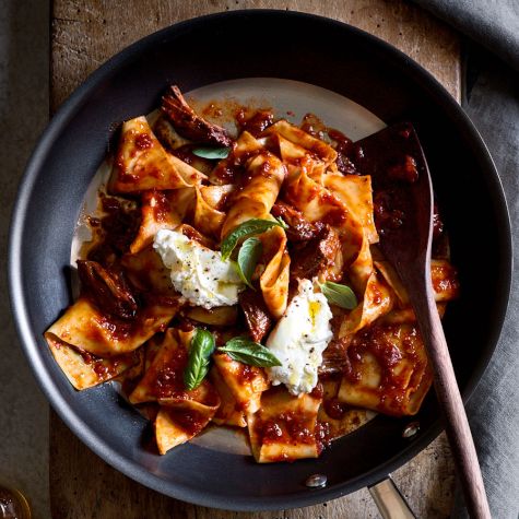 In this recipe, a sauce made from slow-cooked pork is topped with burrata, a ball of fresh mozzarella with a creamy center, for an especially impressive pasta dinner. Fresh pappardelle can be found at many grocery stores and Italian delis, or you can make your own.