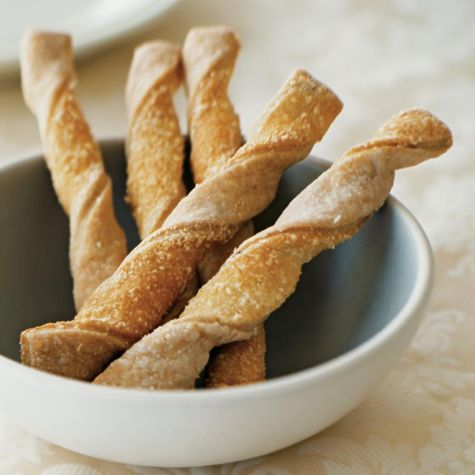 These twists are a welcome change from the traditional crackers and breads that accompany soups and salads. They are flavored with two types of aged cheese— Parmigiano-Reggiano, made from cow’s milk, and Romano, made from sheep’s milk—which together give the twists a pleasant salty, sharp taste.