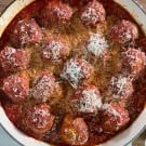 Turn off the heat and return all meatballs to the skillet. Cover the meatballs with marinara sauce and transfer to the oven until the internal temperature of the meatballs reaches 160°F (70°C), about 10 minutes. Remove from the oven and sprinkle with Parmesan. Return to the oven until the internal temperature reaches 165°F (75°C) and the cheese is melted, 5 minutes longer. Serve immediately. Serves 4 to 6.