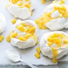 There are two schools of thought with pavlova. You can portion them into individual meringues, or bake as one big mound, ready for an abundance of curd, cream and fruit. In either case, flowery passion fruit curd, fragrant mango and tart passion fruit seeds are ideal companions to the egg-white confection.