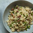 Here, Nigella Lawson cooks pasta much as she would traditional risotto. While Italy respects its traditions, she explains, this way of cooking pasta—pasta risottata—is actually quite the new, cool thing. When Nigella has come across this way of cooking pasta in Italy, it’s not in fact involved orzo or other rice-shaped pasta; the “risottata” part refers to the method, not the pasta or the end result. Pennette or macaroni or other similarly small pasta would also work, though cooking times may vary a little.