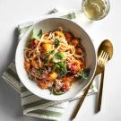 It’s summertime, and the cooking is easy. And this recipe fits the bill perfectly. Featuring peak-season tomatoes that are sweet, juicy and full of flavor, it involves minimal time at the stovetop—just what you want on those warm summer days. Be sure to use tomatoes that are slightly overripe and a bit on the soft side so they’ll break down nicely in the sauce. We like to toss this with long noodles, such as spaghetti, bucatini or mafaldine, a wide, ribbon-shaped pasta with ruffled edges. Rather than draining the pasta, we add it directly from the pot to the sauce, with some of the cooking water still clinging to the noodles; that starchy water helps to enrich and emulsify the sauce.