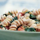 Arugula wilted by the heat of the pasta and tomatoes sautéed just until their skins pop make this dish colorful and fresh tasting. The goat cheese melts into a creamy sauce. Any pasta shape that traps and holds the sauce and greens will work.