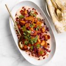 To serve, spread the yogurt sauce on the bottom of a large oval serving platter. Drizzle on the tamarind date chutney and place the sweet potatoes on top. Garnish with the cilantro, onion, pomegranate seeds and a sprinkling of chaat masala and serve. Serves 4.