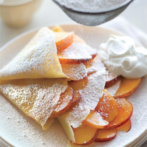 Place 1 crepe on a work surface. Spoon one-eighth of the peaches in an even layer on half of the crepe, then fold over the other half to cover. Fold the crepe in half again, to form a triangle. Place on the prepared baking sheet. Repeat with 7 more crepes and all of the peaches. Brush the tops of the filled crepes with the remaining butter. Bake just until hot throughout, about 5 minutes. To serve, place 2 crepes on each plate. Crown the crepes with a dollop of the mascarpone cream, and then sift confectioners’ sugar over the top. Serve at once. Serves 4.
