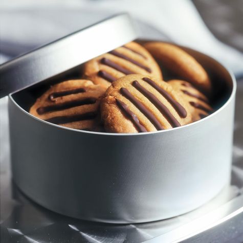 To give these cookies a decorative touch, pipe melted chocolate into the indentations made by the fork tines: Fit a pastry bag with a very small plain tip. Fold down the edge of the bag, creating a cuff, and fill the bag no more than halfway full with the chocolate. Unfold the top and twist it to squeeze the chocolate toward the tip. Holding the bag at a 45-degree angle with one hand, and leaving a small gap between the tip and the cookie, squeeze the bag to release the chocolate in a line.