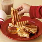 Place the sandwiches on the preheated panini press and cook until the bread is golden brown and toasted, about 2 minutes. Transfer the sandwiches to a cutting board and cut each in quarters. Repeat with the remaining sandwiches. Serve with honey for dipping. Serves 4.