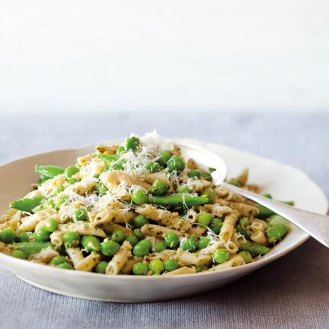 Remove 3/4 cup of the pasta cooking water and reserve. Drain the pasta and peas. Put the pesto in a large bowl. Whisk in enough of the reserved cooking water to thin to a sauce. Add the pasta and vegetables and toss to coat. Thin with more cooking liquid and adjust the seasoning with salt. Serve immediately and pass additional cheese alongside. Serves 4.