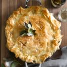 To make the filling, in a Dutch oven over medium heat, melt the butter. Add the flour and cook, stirring constantly, until the mixture smells fragrant and nutty, about 2 minutes. Whisk in the Madeira and demi-glace. Slowly add the chicken stock, whisking until smooth, and bring to a boil. Add the diced onion, celery, mushrooms, thyme, tarragon and bay leaf and cook until the vegetables are almost tender, about 10 minutes. Add the potatoes, turkey and pearl onions and season with salt and pepper. Cook until the potatoes are tender, about 10 minutes. Remove from the heat and let cool for 10 minutes. Remove the bay leaf and discard.