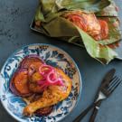 To serve, remove the foil and place each banana-leaf packet on an individual plate. Open the packets and top each portion with 1/4 cup of the pickled onions. (Save the rest of the onions for another use.) Serve immediately. Serves 4.
