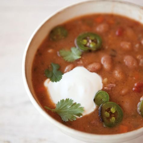 In a large, heavy pot over medium-high heat, warm the olive oil. Add the onions and carrots and sauté until softened, about 6 minutes. Stir in the minced chiles, garlic, oregano, cumin, coriander and chili powder and sauté until fragrant, about 2 minutes. Add the ham broth, tomatoes with their juices and beans. Bring to a boil, reduce the heat to low and simmer for 20 minutes to blend the flavors. Remove from the heat and let cool slightly.