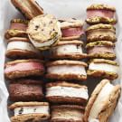 To create these ice cream sandwiches, we use an ingenious trick: slice the pints crosswise (carton and all) into rounds, then remove the packaging and tuck the ice cream between two cookies. (You’ll need to trim some of the rounds to fit.) Be sure your ice cream is frozen solid before cutting it; otherwise, you’ll have a melty mess. We’ve suggested a few flavors of ice cream, but feel free to use your favorite. You can also mix things up by swapping in other cookies, such as our Perfect Chocolate Chip Cookies or our Chocolate Chunk and Macadamia Oatmeal Cookies. When it comes to ice cream sandwiches, you really can’t go wrong!