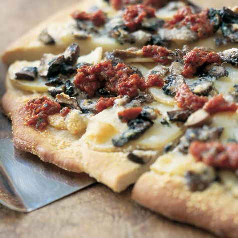 A thin layer of sliced Yukon Gold potatoes makes an unusual but delicious topping for pizza, especially with the addition of sautéed mushrooms and tomato-basil pesto. You can use shiitake, cremini, oyster or small portobello mushrooms, or a combination. This version of pesto, made with tomatoes, is lower in fat than the traditional sauce because the juice from the tomatoes stands in for some of the olive oil. Make a double batch of pesto and use the extra as a topping for baked potatoes or pasta.