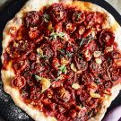 At Redd Wood pizzeria in Yountville, California, Chef Richard Reddington serves wood-fired pizzas made with the Napa Valley’s freshest seasonal ingredients. Here, we use the chef’s pizza crust mix, pizza sauce and drizzling oil to make a summery pie topped with homemade oven-roasted tomatoes. If you’d rather not take the time to roast the tomatoes, feel free to replace them with a handful of purchased sun-dried tomatoes. The recipe makes twice as much crust as you will need, so store the extra dough in the refrigerator or freezer for future use, or double the toppings and make two pizzas.