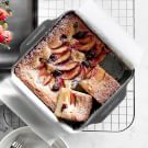 Bake until the top is golden, the edges pull away from the pan and a tester inserted into the center of the buckle comes out clean, 50 to 60 minutes. Let cool on a wire rack for about 30 minutes before serving. Serves 9.