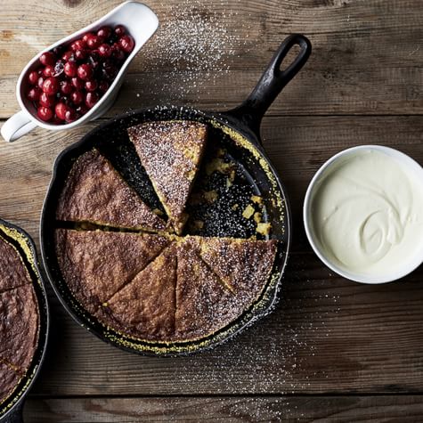 Preheat an oven to 350°F (180°C). Butter an 8-inch (20-cm) cast-iron fry pan and dust with polenta. Tap out any excess.