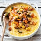 Transfer to the oven and bake just until the polenta begins to set, about 15 minutes. Remove from the oven and top evenly with the roasted vegetables. Continue to bake until the vegetables are heated through, about 15 minutes. Serve the polenta directly from the dish. Serves 6.