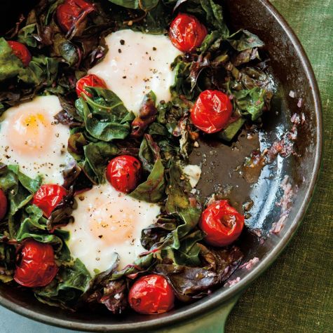 Divide the polenta between 2 warmed plates, spreading it over the center of the plates in a circle. Use a spatula to transfer the eggs and vegetables around them to the plates, arranging atop the polenta. Serve immediately. Serves 2.
