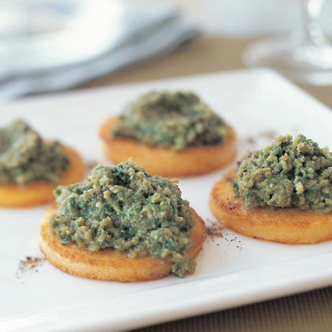 Arrange the polenta slices on a platter, top each with a generous spoonful of the eggplant pesto, sprinkle with pepper and serve. Makes 20 rounds.