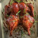 Meanwhile, pour any remaining glaze into a small saucepan and bring it to a boil over high heat. Remove from the heat and set aside. Using a sharp, heavy knife or poultry shears, cut the duck in half along each side of the breastbone. Cut each half in half again, separating the breast and wing from the thigh and leg. Divide the duck among warmed individual plates. Pour the warm glaze over the duck meat and serve immediately. Serves 2 or 3.