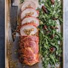 What could be tastier than wrapping pork in more pork? Besides adding great flavor, the prosciutto gives the pork loin a crispy exterior and holds in moisture during roasting in this easy sheet pan dinner. Be sure to toss the arugula with the meat juices on the pan, which will add depth to this wilted salad.