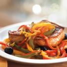 Nearly every region of Italy has its version of peperonata–sautéed sweet peppers that are usually served as a contorno, or side dish, sometimes with capers, anchovies, herbs and/or olives for extra flavor. Here, pork chops are braised with the peppers to create a main course popular in southern Italy. Use any leftover peperonata to make a frittata for another meal.