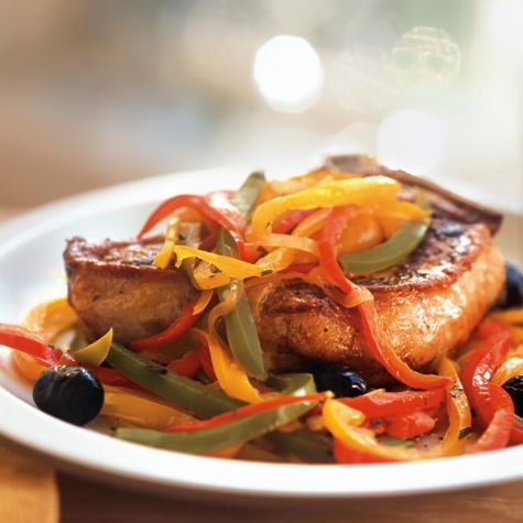Transfer the chops to a warmed platter or individual plates, spoon the olives and peppers over the top and serve immediately. Serves 4.