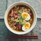 Cook the ramen noodles according to the package directions. Bring a large pot of water to a boil, add the eggs and reduce the heat to a simmer. Simmer the eggs for 5 to 6 minutes. Remove the eggs from the water, let cool until they can be handled and peel them. Cut each in half lengthwise.
