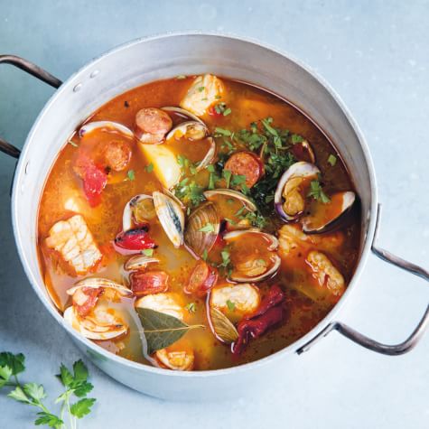Cataplana is the name for both an array of Portuguese seafood dishes and for the clam shell–shaped vessel in which they are cooked. Here, a saucepan with a tight-fitting lid stands in for the more traditional pan. If you cannot find linguiça, a mildly spicy smoked Portuguese pork sausage, any high-quality fresh spicy Italian sausage can be substituted. Make sure the aioli is at room temperature just before serving, as it will blend in better and not cause the soup to cool.