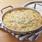 The potatoes should be sliced to a uniform thickness so they cook evenly. A mandoline is a good tool for slicing the potatoes. Any leftovers can be reheated in a 300°F oven for 8 to 10 minutes.