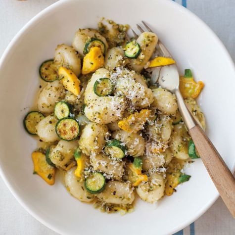 Adding zucchini and almonds to this easy pesto makes the sauce creamy without using cream. Paired with purchased potato gnocchi, this vegetarian dish is very filling, so serve it with a simple salad, like baby greens with sliced tomatoes.