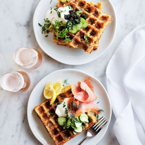 What’s better than classic Belgian waffles for brunch? Crispy potato waffles! Like a cross between potato pancakes and regular waffles, they’re fun and delicious—and will satisfy gluten-free diners as well. Here we finish the waffles with savory ingredients, including smoked salmon, cucumber and crème fraîche, but choose whatever toppings you’d like; caviar in place of the salmon makes a particularly elegant presentation. And feel free to riff on our basic recipe with your favorite add-ins, such as spices, herbs or cheese—just stir them in with the potatoes, salt and pepper.