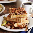 Combining thick, golden waffles with a rich praline topping, this dish is perfect for a weekend brunch.