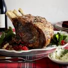 Set the roast, fat side up, on a rack in a large roasting pan. Transfer to the oven and roast for 20 minutes. Reduce the oven temperature to 350°F (180°C) and continue roasting until an instant-read thermometer inserted into the center of the meat, away from the bone, registers 125° to 130°F (52° to 54°C) for very rare to medium-rare, 45 to 50 minutes more, or until done to your liking. Twice during the cooking time, carefully baste the roast with the pan juices. If the roast begins to brown too quickly, cover with aluminum foil. Transfer the roast to a carving board, cover loosely with foil and let rest for 15 to 20 minutes.